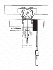 In most applications, hoists are suspended overhead via a lug, hook or trolley. Lug suspensions are used when a hoist is permanently affixed to a location or to attach the hoist to a rigid mount trolley. Hook suspensions consist of a single point of suspension through the use of a top hook. Hook suspended hoists have the advantage of being easily moved from locations. Trolley suspensions incorporate a hoist attached to a push/manual, hand-geared, or motor driven trolley. (See diagram). A push trolley is generally used for relocating lighter loads and in instances where spotting is not crucial. a hand-geared trolley is used for loads that are slightly heavier and that require load spotting accuracy. Powered trolley are often incorporated in applications requiring the relocation of heavy loads, repetitive lifting and lowering, and for faster hoisting speeds.